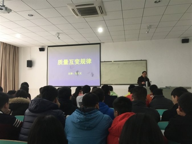 3月8日下午4:20,我院“青马工程”培训班在理工楼604举行新学期第一次培训。刘正义副院长结合实际,深入浅出地为学员们讲授了马克思主义原理中的“质量互换规律”和“否定与否定之规律”。勉励学员们在学习、生活、工作中要用辩证的方法去思考问题,直面人生,勇敢地面对各种挑战,为民族的振兴贡献自己的毕生。