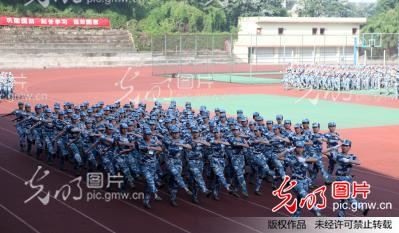 2016年9月12日,重庆科创职业学院2016级新生军训结业暨开学典礼在校园举行。图为新生们英姿飒爽进行分列式表演。