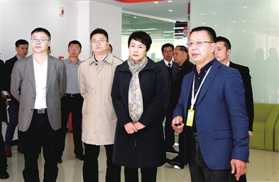 3月31日,市委常委、统战部部长宋爱荣一行来永视察我区校企合作和工业发展,蒋平、滕宏伟、罗清泉等一同视察。图为宋爱荣一行在吉之汇国际农贸物流城视察并听取相关情况介绍。记者范辉摄