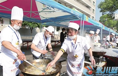 4月13日,重庆科创职业学院举办了第五届美食节暨创新菜大赛。该校6支食堂队30多名厨师身着厨师服、头戴厨师帽,经过清洗、切配、烹制、装盘等环节,精心烹饪出霸王鱿鱼、香煎嫩豆腐、石爆腰花等数十种秀色可餐的美食。最后,通过菜品介绍、展示以及评委打分等环节评出获奖菜肴。
