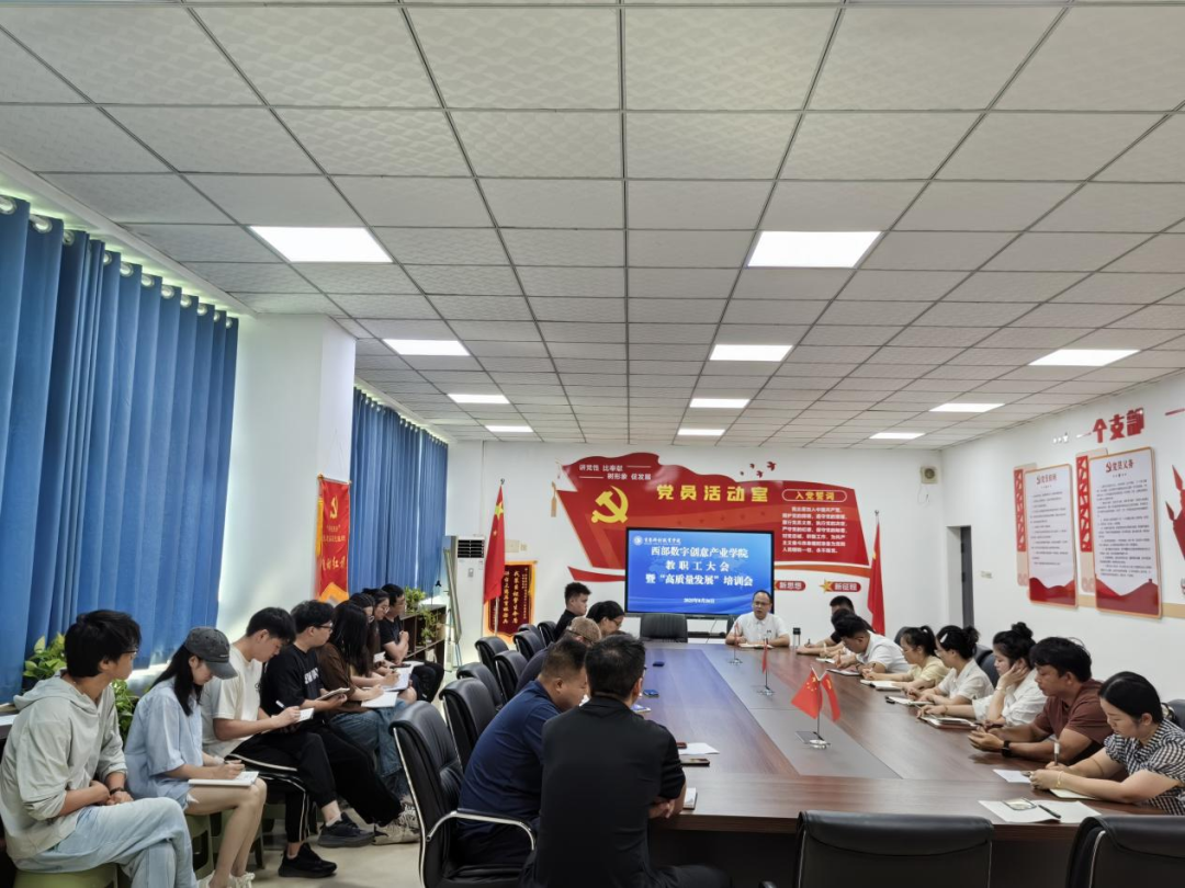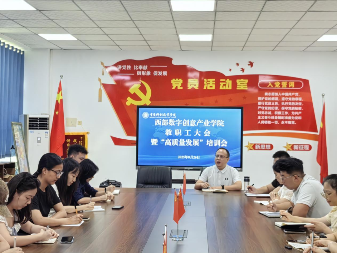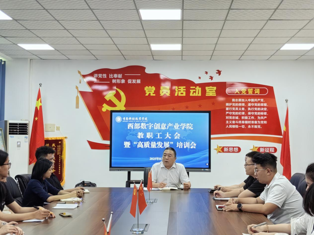 2025年8月26日,西部数字创意产业学院新学期教职工大会暨“高质量发展”培训会顺利召开。学院全体教职工共同回顾过往成就,规划新学期发展蓝图,以“高质量发展”为核心主题,为学院新学期的工作吹响奋进号角。