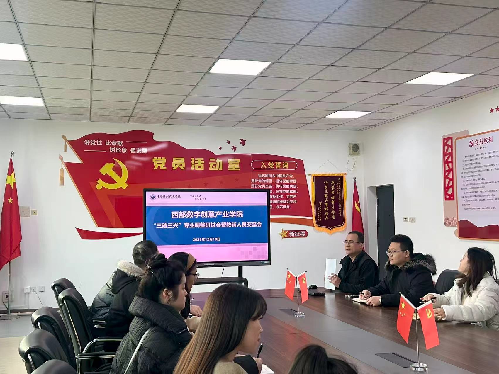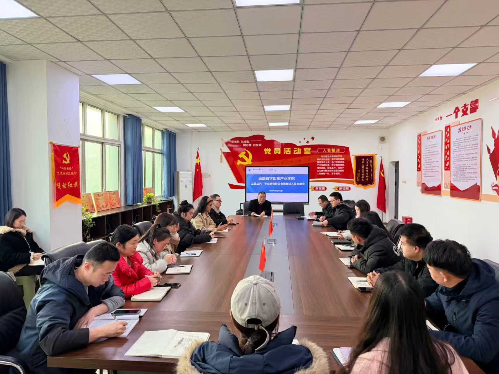为深入推进“三破三兴”改革要求,优化专业布局与人才培养体系,2025年12月10日下午,西部数字创意产业学院在精益楼405室隆重召开“三破三兴”专业调整研讨会暨教辅人员交流会。学院领导、全体教师及相关教辅人员参会,部分教师通过线上形式同步参与,会议由王鹏威院长主持。