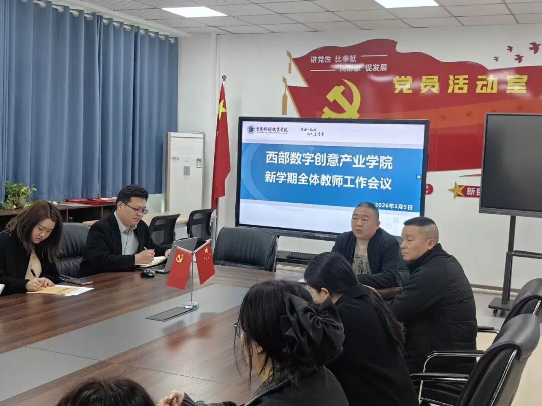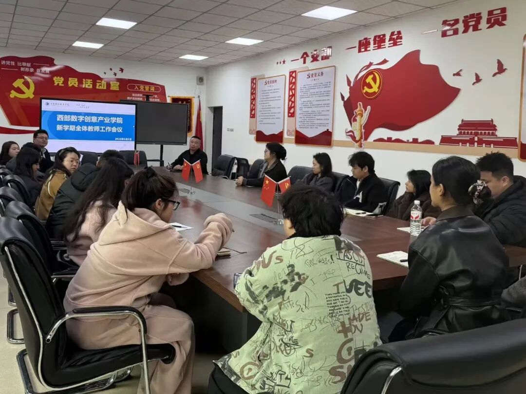 为统筹部署新学期教学工作,明确工作任务与要求,凝聚育人共识,3月5日,西部数字创意产业学院在精益楼405召开2025-2026学年第2学期全体教师工作会。学院院长杜德银、副院长张陵,教研室主任杨成斌、副主任赵青青出席会议,全体教师参会,会议围绕开学筹备、教学重点、教师能力提升等核心工作作出全面安排。