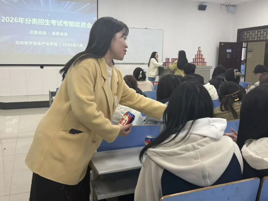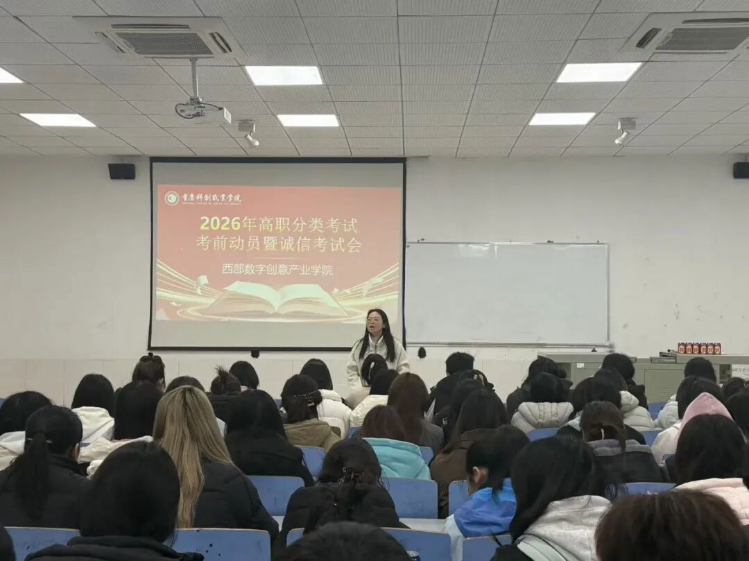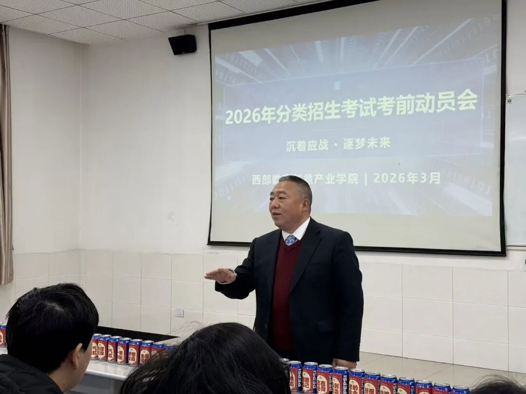 为充分调动学子备考积极性,明确奋斗目标,3月19日,西部数字创意产业学院在理工楼隆重举行2026年专升本与分类招生考试动员大会。学院院长杜德银、党支部书记赵伟、团总支书记赵敏、团总支指导老师钟小路及全体辅导员到场,共同为备考学子加油鼓劲。