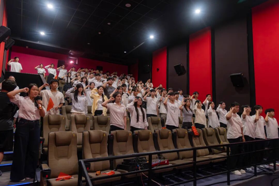 观影结束后,学生会主席团成员邓懿鑫带领全体学生庄严宣誓,铮铮誓言传递出青年铭记历史、勇担使命的坚定信念;随后,全体观影成员手持小国旗,齐声高唱《歌唱祖国》,激昂歌声响彻现场,将活动气氛推向高潮。最后,学院党支部书记赵伟作总结讲话,进一步引导学生从历史中汲取奋进力量,砥砺初心,立强国之志,践报国之行,努力成长为担当民族复兴大任的时代青年。