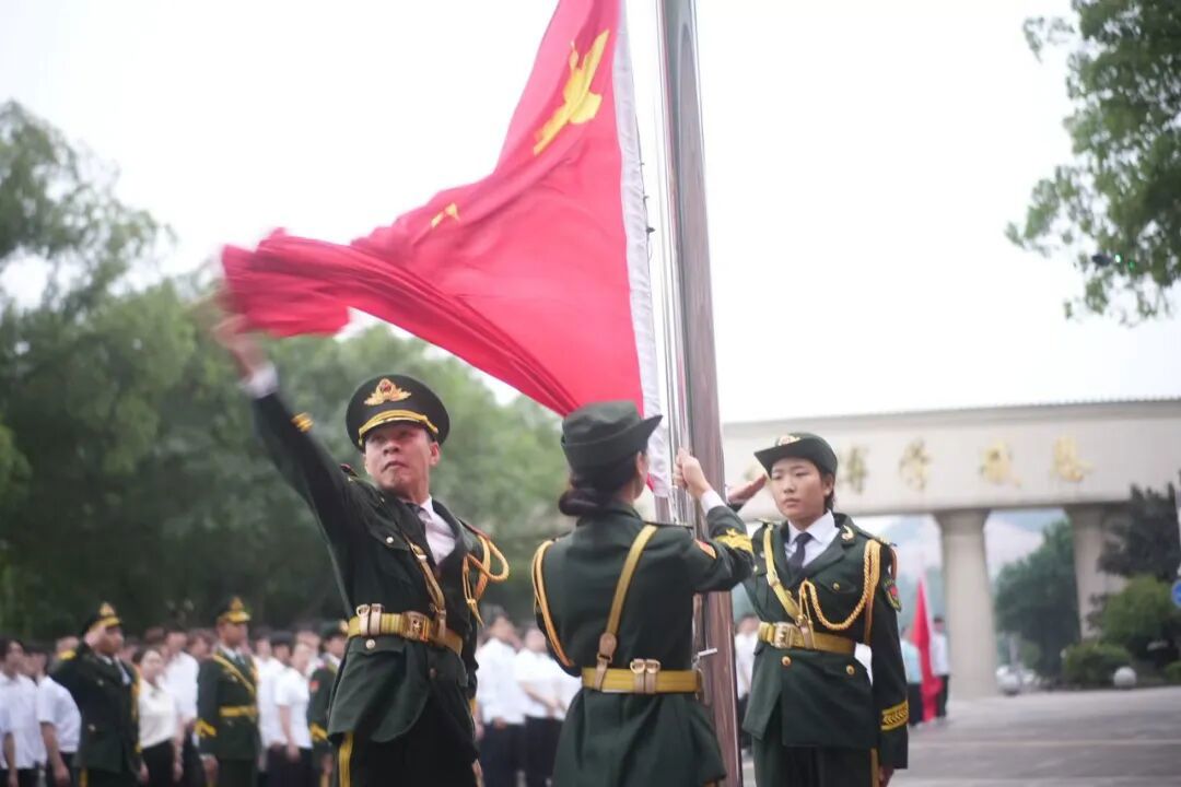 伴随着铿锵有力的步伐,国旗护卫队队员身着整齐制服,手护五星红旗稳步走向国旗台。在全体师生的注目下,《中华人民共和国国歌》激昂奏响,五星红旗冉冉升起,迎风飘扬。全体师生肃立行注目礼,高唱国歌,嘹亮的歌声中饱含着对祖国的无限热爱与对革命先烈的深切缅怀。