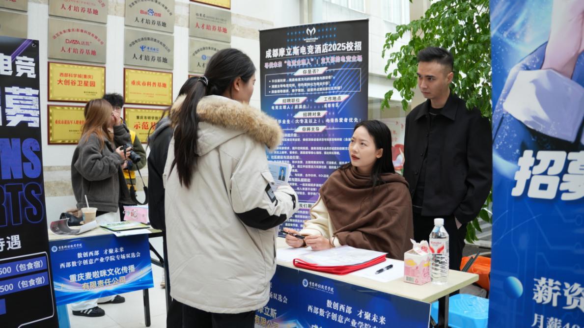 为精准助力 2026 届毕业生逐梦青春,搭建毕业生与优质企业双向奔赴的坚实平台,在任课教师和辅导员悉心指导下,同学们充分准备、自信迎机遇。11 月 26 日上午,西部数字创意产业学院“数创西部·才聚未来”2025 年专场双选会在通惠楼大厅启动。重庆麦啦咪文化、重庆可酷数字科技、海豚电竞等 24 家行业头部企业携 120 余个岗位到场,为 2026 届毕业生开通就业“直通车”。校党委副书记、副校长钟代军、副校长殷朝华、就业指导中心主任胡未以及西部数字创意产业学院领导班子深入现场,与校企亲切交流,护航求职路。