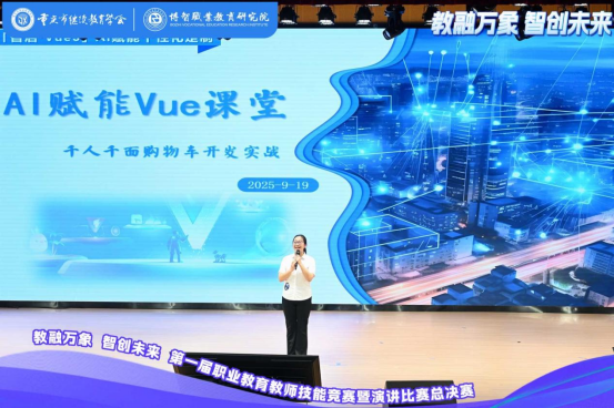 9月19日,由重庆市继续教育学会与重庆市博智职业教育研究院联合主办的"第一届职业教育教师技能竞赛暨演讲比赛总决赛”在重庆圆满落幕。我校人工智能与大数据学院教师周礼萍在"智慧课堂"赛项中凭借作品《智启VUE3:AI助力个性化定制》荣获全国三等奖,展现出优异的竞技水平。