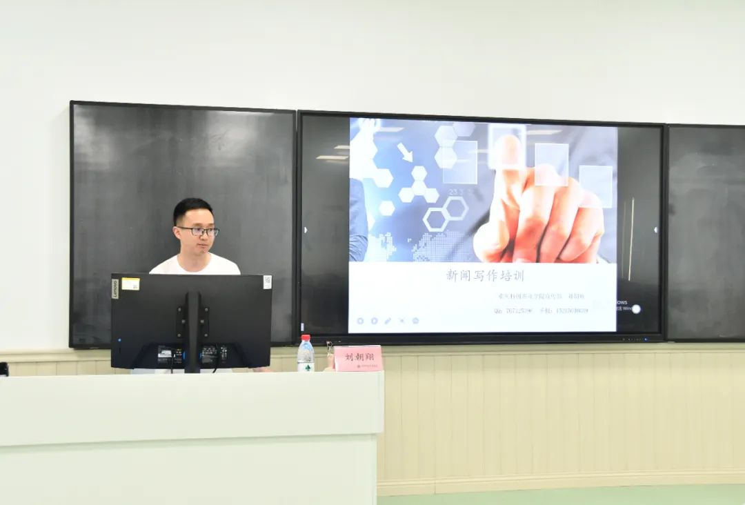 为推动学院新闻宣传工作再上新台阶,提高学生干部在新闻撰写和文稿编辑方面的专业能力,提升学院的知名度、美誉度和影响力,2024年6月18日在理工楼406教室开展了新闻写作培训。本次培训邀请了学校新闻科科长刘朝翔老师主讲,学院新媒体中心和团学骨干参与学习。