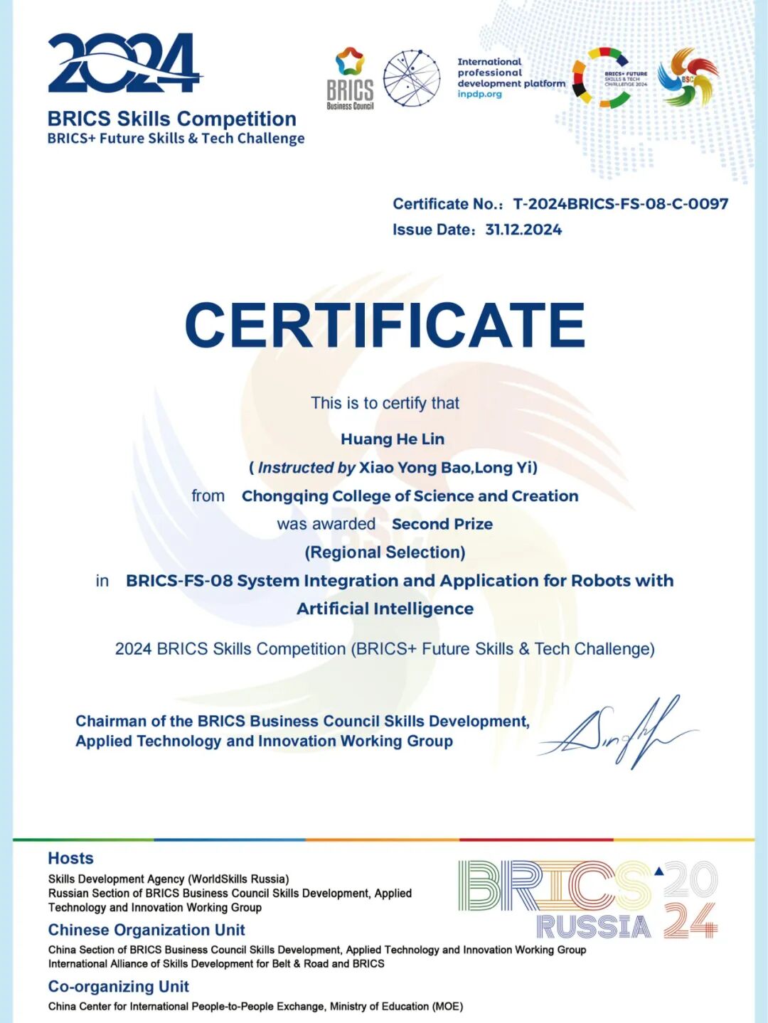 2024年12月获金砖国家职业技能大赛人工智能机器人系统集成及应用赛项国际总决赛优秀奖