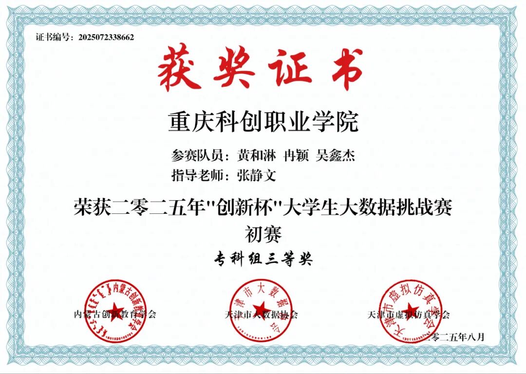 2025年8月获“创新杯”大学生数据挑战赛三等奖