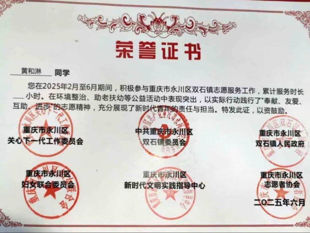 在学习与工作之余,黄和淋更是将志愿服务作为践行青春担当的重要途径。他积极参与大学生志愿者走进社区、支教帮扶、科普知识进校园等各类公益活动,累计志愿服务时长达到135.5小时。在社区里,他用耐心与热情为居民提供帮助;在支教路上,他用知识与爱心点亮孩子的梦想;在校园中,他用行动传递科普力量。通过一次次亲身实践,他深入了解社会需求,真切体会到“帮助他人、回馈社会”的深刻意义,用点滴行动诠释着“奉献、友爱、互助、进步”的志愿精神。