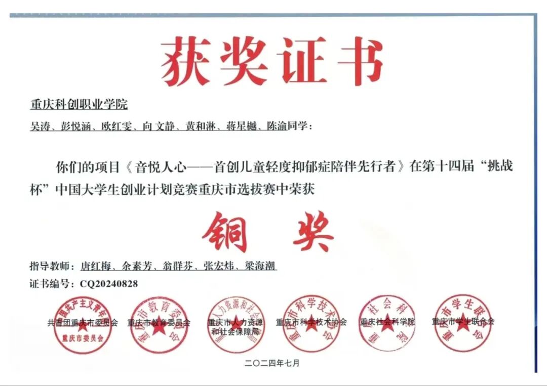 2024年7月获“挑战杯”重庆市铜奖