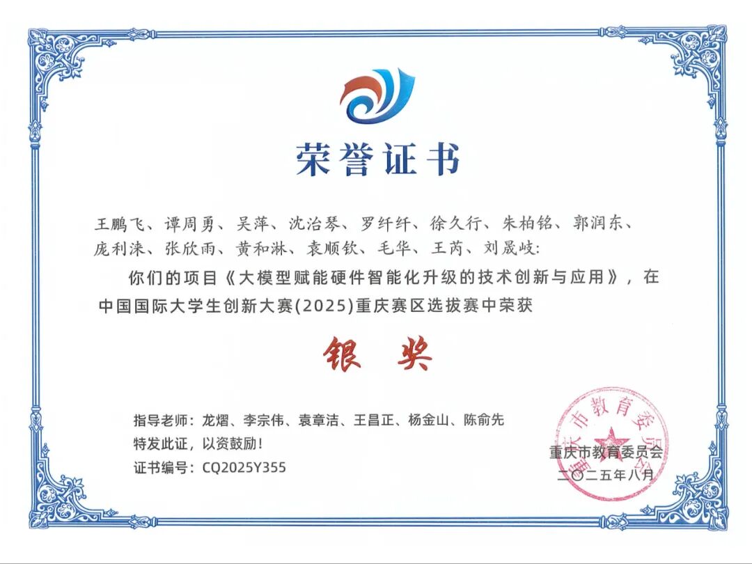 2025年8月获中国国际大学生创新大赛重庆银奖