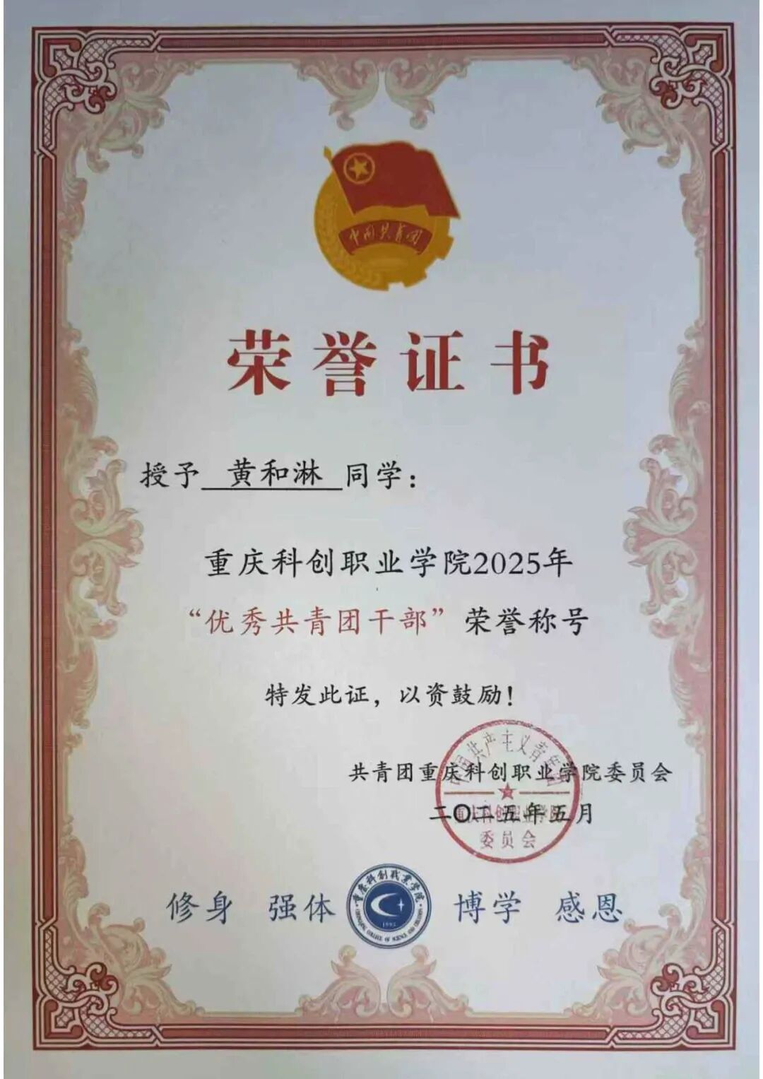 2025年5月获重庆科创职业学院“优秀共青团干部”