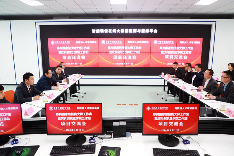 为进一步发挥技能大师引领作用,加快推进高技能人才队伍建设,4月11日,陈良国家级技能大师工作室重庆科创职业学院工作站项目交流会在我校人工智能学院工业大数据应用中心顺利举行。国务院政府特殊津贴专家、全国技术能手、重庆电子工程职业学院电子与物联网学院院长陈良,陈良国家级工作室常务副主任武新,重庆电子工程职业学院电子与物联网学院工程中心主任易国键,陈良国家级工作室副主任李大年,世界技能大赛冠军、全国技术能手李小松,重庆科创职业学院副校长殷朝华、滕斌,人事处副处长徐晓庆、人工智能学院院长徐刚强等教师代表参会。会议由人工智能学院副院长曹小平主持。