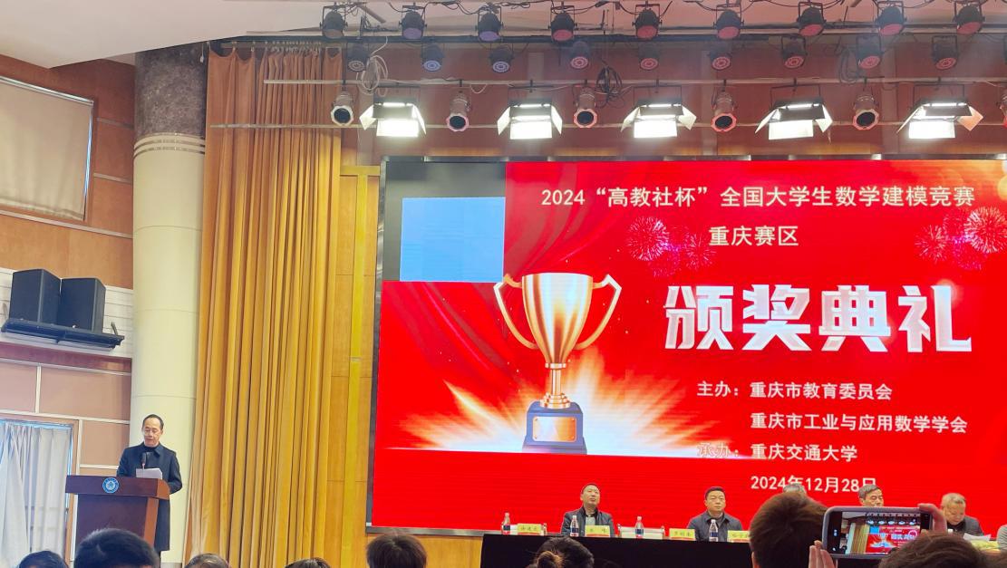 12月28日,由教育部高等教育司、中国工业与应用数学学会共同主办的2024年高教社杯全国大学生数学建模竞赛(重庆赛区)颁奖典礼在重庆交通大学举行。我校罗明奎教授作为重庆赛区组委会监事长在会上做了2024年数学建模竞赛工作总结并宣布了获奖名单。同时,张静文老师作为优秀组织工作者代表;邓清源同学作为全国一等奖获得者代表上台领奖。