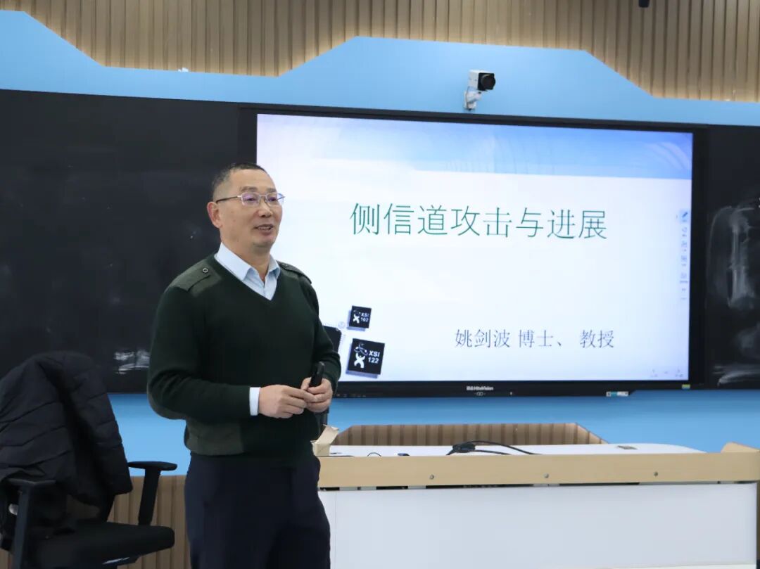 讲座中,姚剑波教授围绕主题系统讲解。他指出,侧信道攻击与传统攻击不同,不针对密码算法的理论弱点,而是捕捉密码设备运行时产生的能量、电磁、缓存及故障输出等物理泄露信息,通过分析密钥相关特征点恢复密钥,对密码系统安全构成严重威胁。