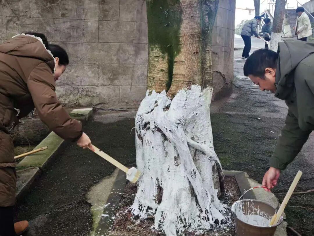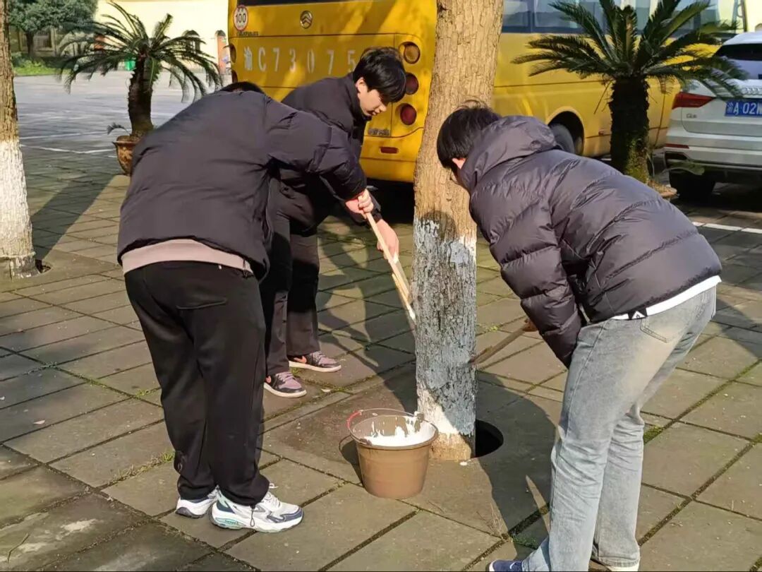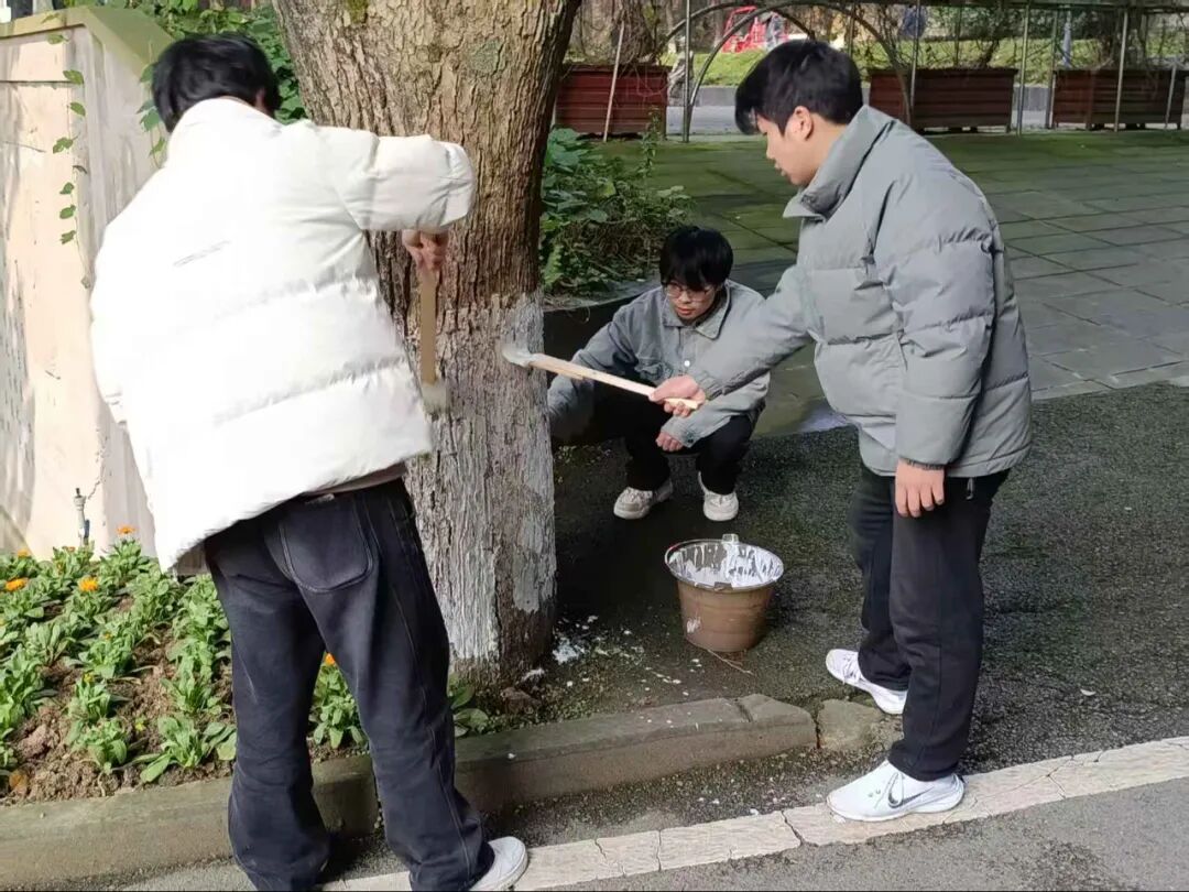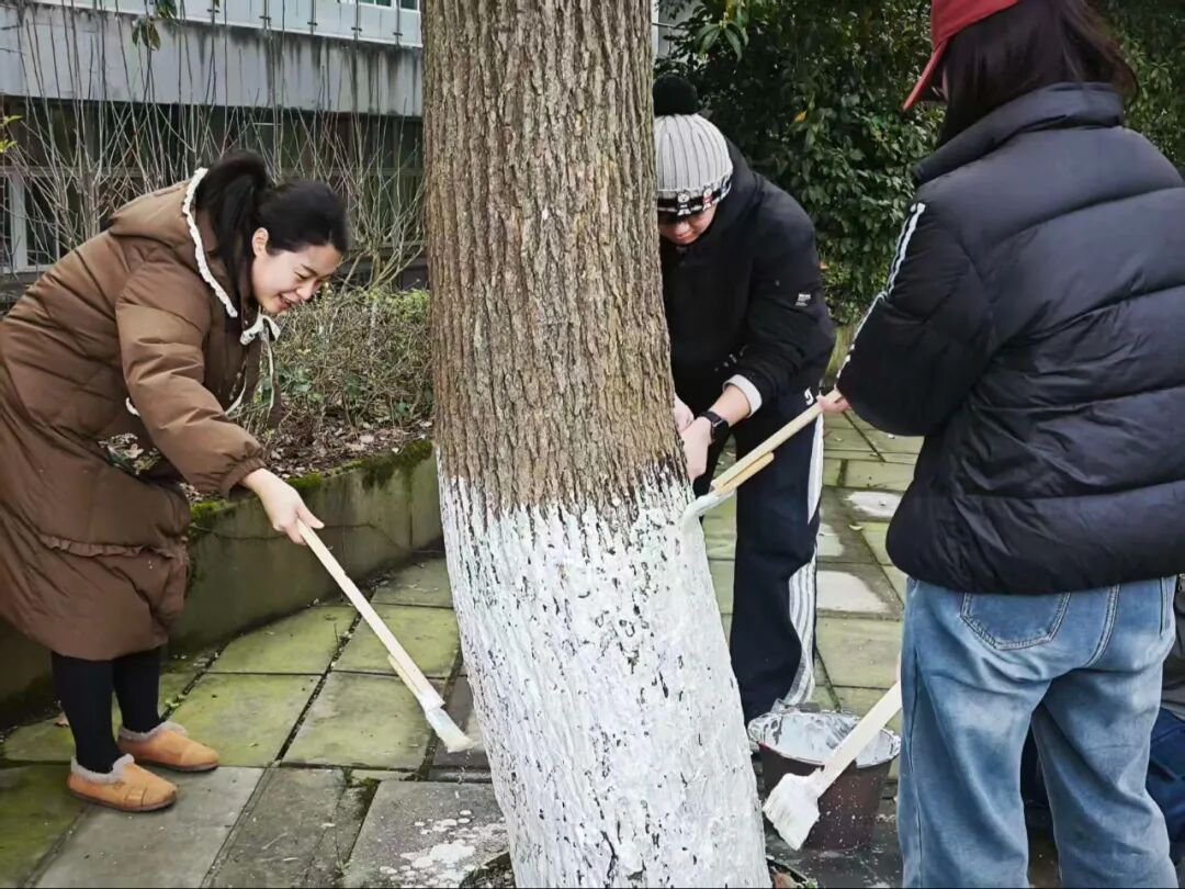 冬日寒意未消,但志愿者们的服务热忱丝毫不减。林荫道间,青年学子们忙碌的身影穿梭其间,通过系统化的树干涂白作业,原本粗粝的树干渐渐被规整的防护涂层覆盖。大家分工协作、热情高涨,默契配合完成每一项流程,忙碌有序的身影与校园林木相映成趣,勾勒出一道充满生机与温情的校园人文风景线。
