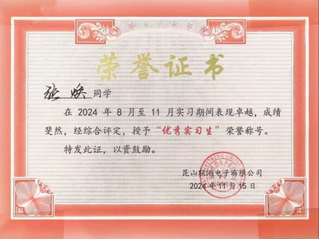 学业上,“专注”与“钻研”是他的鲜明标签。课堂上,他专注记录电子信息领域核心技术要点与实操心得,笔记本上密密麻麻的标注见证着点滴积累;课后,实验室成为他的“第二课堂”,他常常沉浸于电路设计、产品开发的实践中,遇到难题便查阅文献、虚心求教,在无数次调试与复盘里锤炼过硬本领。这份执着与坚守,不仅让他的专业成绩稳居前列,更练就了扎实深厚的专业功底。理论与实践的深度融合,让他在成长路上稳步前行。2024年8-11月,张焕在实习岗位上兢兢业业、表现突出,获评“优秀实习生”荣誉称号;同年12月,凭借优异的综合表现与学业成绩,他斩获校级“何济奖学金”二等奖,用实际行动印证了“勤能补拙、笃行致远”的深刻内涵。