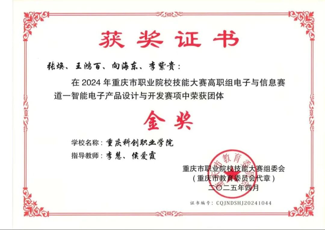 2025年4月获2024重庆市职业院校技能大赛-智能电子产品设计与开发赛道-金奖