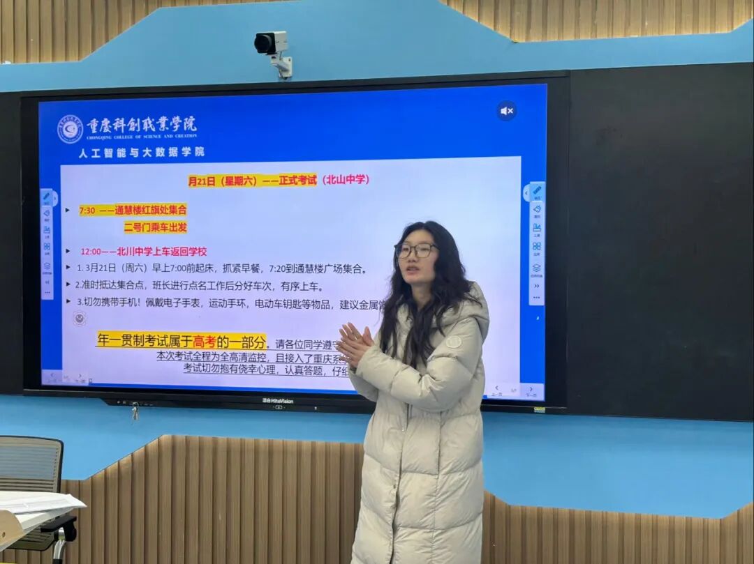 2026 年 3 月 18 日,人工智能与大数据学院在学校理工楼 505教室召开 2026 年高职分类考试考前动员大会,为即将奔赴考场的学子鼓劲加油、明确考试要求,助力大家以最佳状态迎战考试。学院党总支书记姜涛出席会议并作动员讲话,杨惠淋老师就重庆市高职分类招生考试相关事宜进行细致讲解。