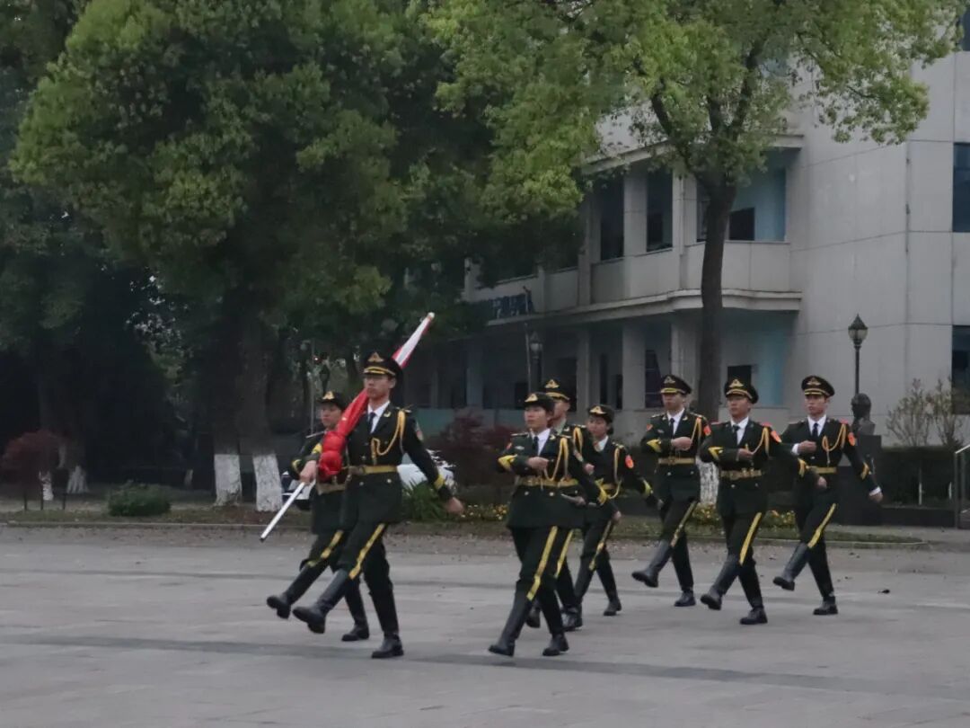 伴随着激昂雄壮的《义勇军进行曲》,护旗手身姿挺拔、步伐铿锵,迈着整齐有力的步伐护送国旗走向升旗台。