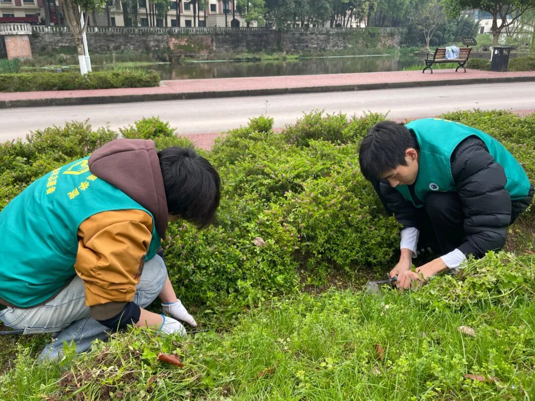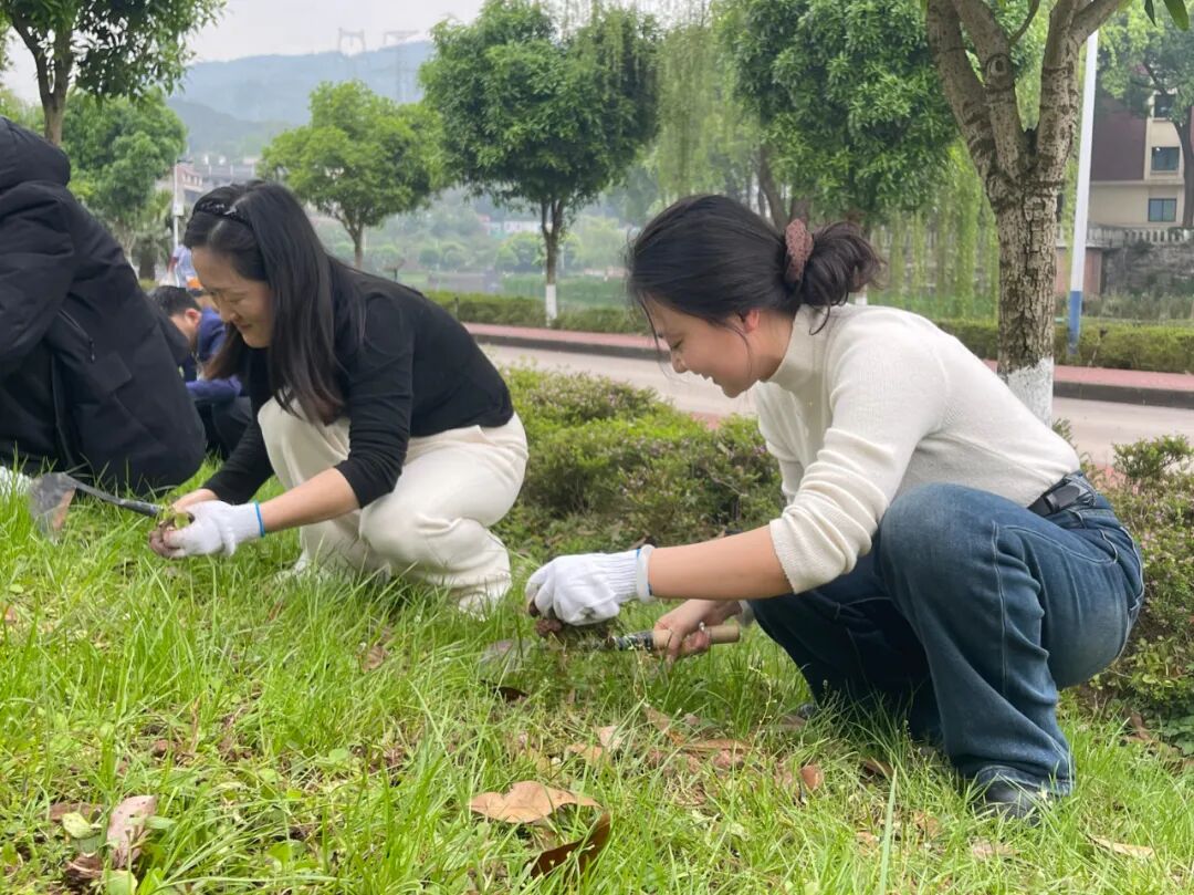 活动过程中,师生协同联动,展现出高度的工作热忱。在月亮湖草坪区域,志愿者队伍通过人工拔除与杂草清理相结合的方式,系统开展杂草清除作业。老师们现场指导,规范操作流程,确保安全的同时高效作业。